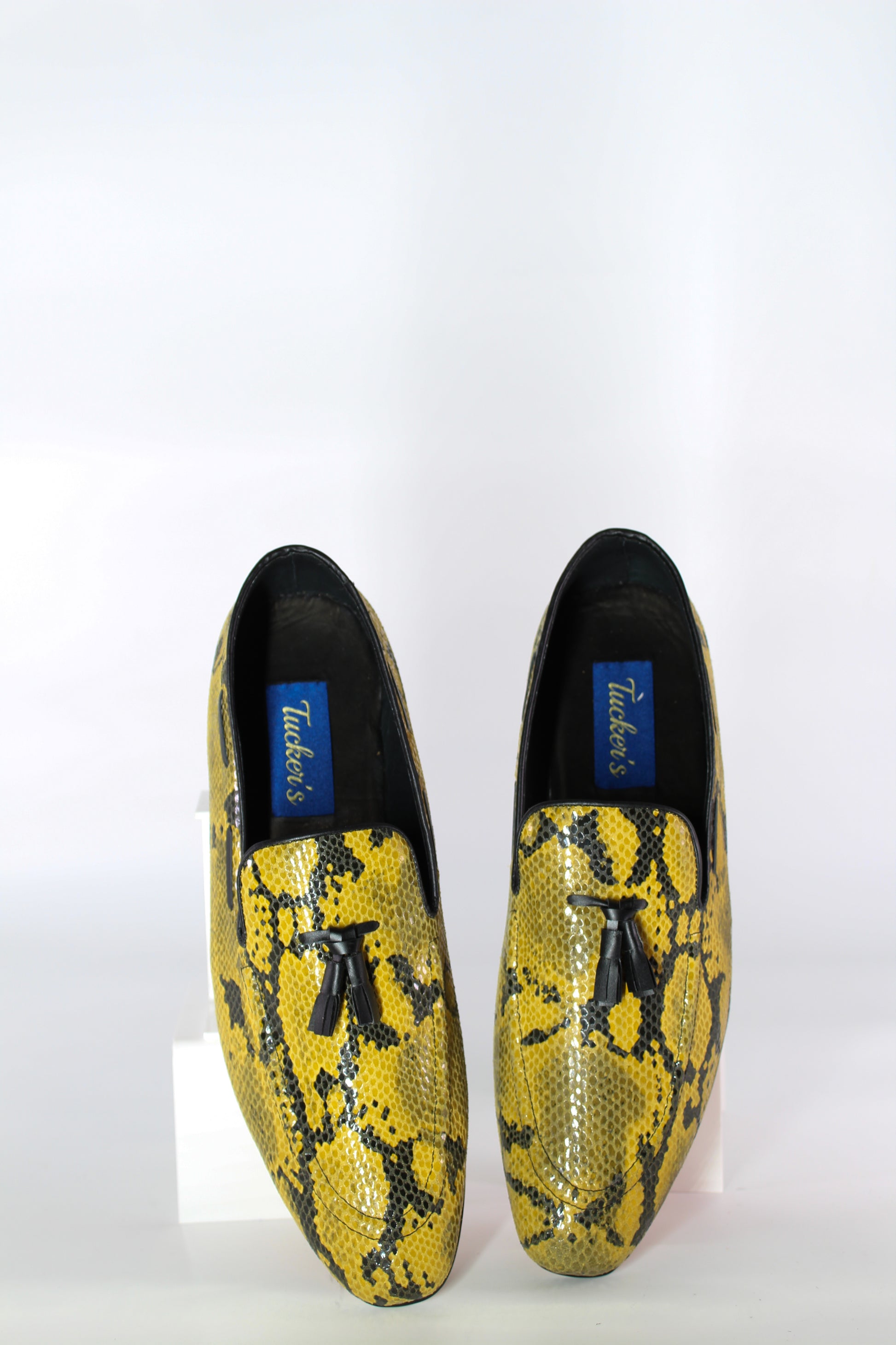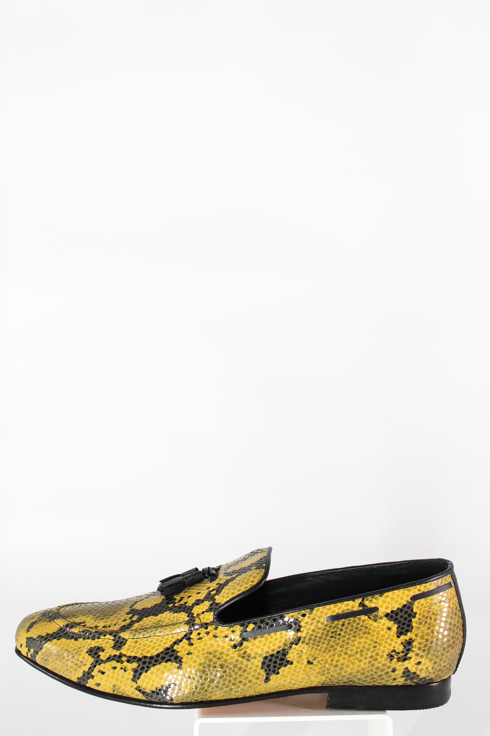 Go bold with these loafers in electric yellow leather embossed to simulate the scales of a Python. These brushed loafers, 100% handcrafted in high-quality embossed cowhide, are ideal for bringing elegance and sophistication to the demands of the modern man. The contrast of yellow with black on the brushes, their edges and the silhouettes on the scales give it an ultra-modern look that will be the focus of attention anywhere. Its leather sole gives it the brand's own distinctiveness and its internal leather lining maintains comfort and durability.